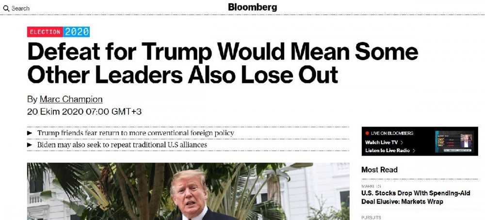 ABD merkezli medya kuruluşu Bloomberg, ABD Başkanı Donald Trump'ın seçimleri kaybetmesi durumunda Cumhurbaşkanı Recep Tayyip Erdoğan'ın da "kaybeden" liderler arasında yer aldığını söyledi.