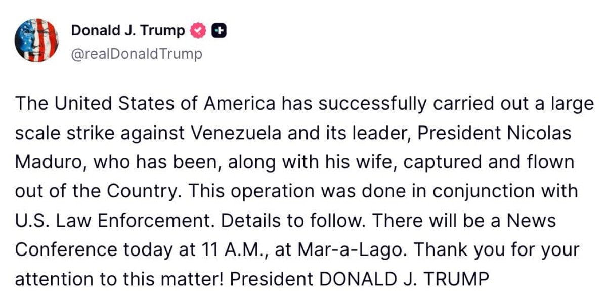 Trump, Truth Social paylaşımında, "ABD, Venezuela ve lideri Başkan Nicolas Maduro'ya karşı büyük çaplı bir saldırı düzenlemiş ve Maduro, eşi ile birlikte yakalanarak ülke dışına çıkarılmıştır.