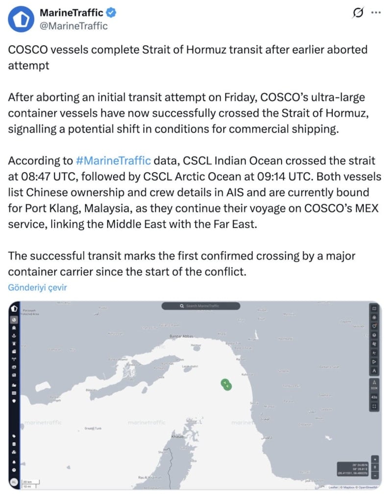Orta Doğu'daki çatışmaların ortasında, iki büyük Çin konteyner gemisinin ikinci denemede Hürmüz Boğazı'ndan geçtiği duyuruldu.