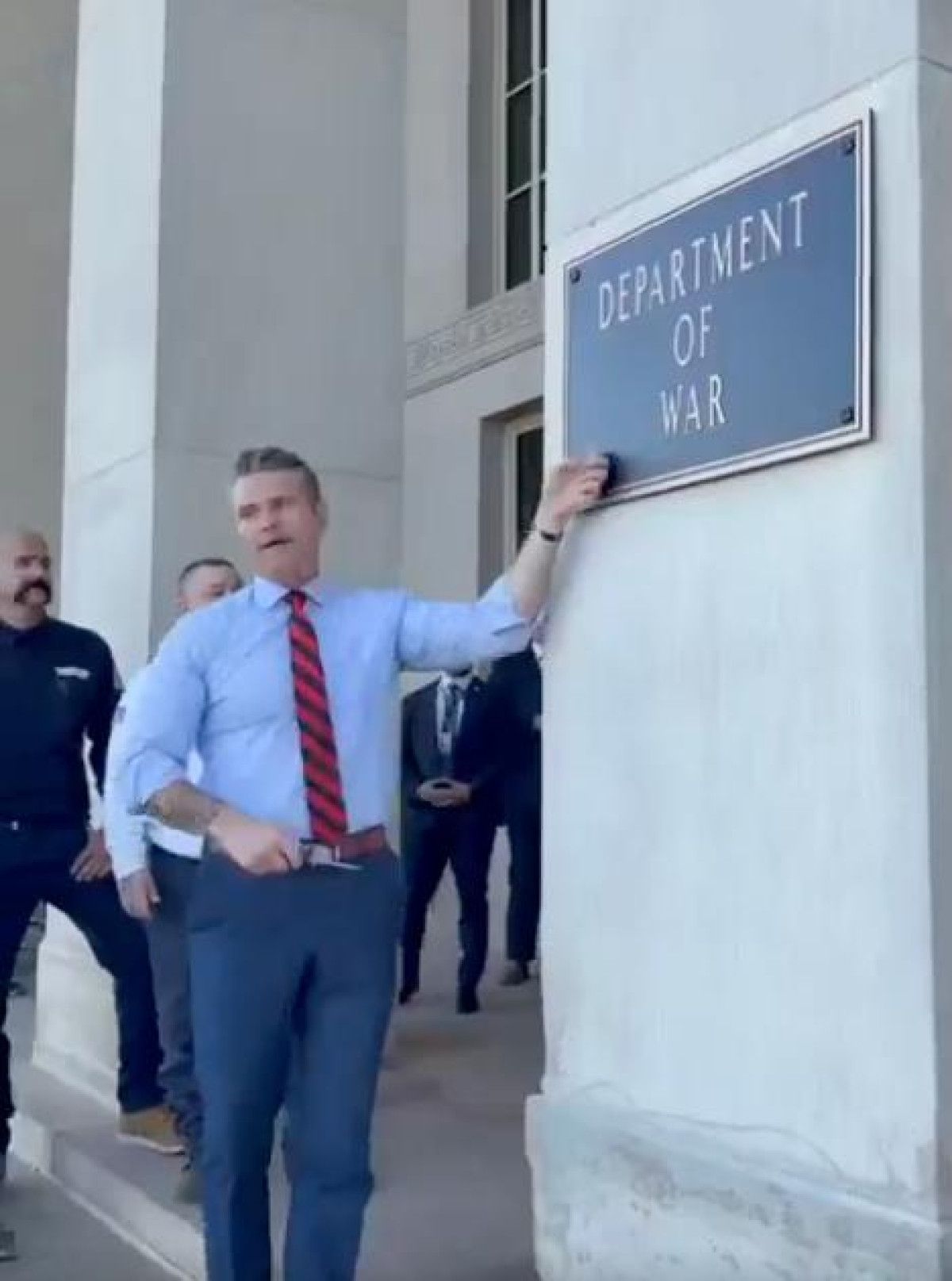 ABD Savunma Bakanlığı binasındaki tabelalar, "Savaş Bakanlığı" yazılı bronz levhalarla değiştirilerek Pentagon'un ismi Savunma'dan Savaş'a geçirildi.