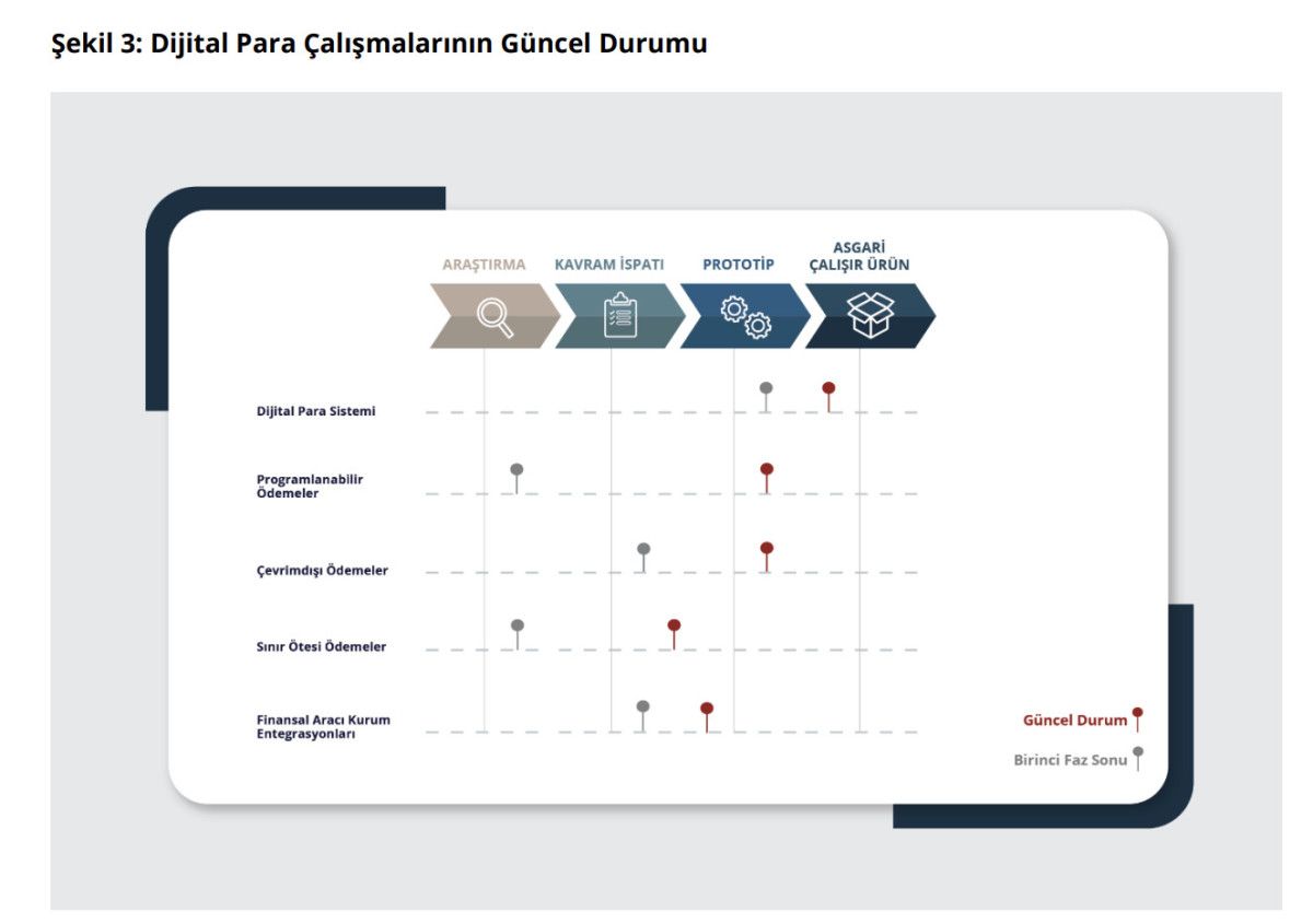 Dijital Türk Lirası Projesi'nin ikinci faz ilerleme raporunda İkinci fazın tamamlanmasının ardından, dijital Türk Lirası'nın tedavülüne ilişkin karar verilmesi halinde yasal düzenlemeler dahil ilgili süreçlerin yürütüleceği üçüncü faz çalışmalarına geçilmesinin hedeflendiği bildirildi.
