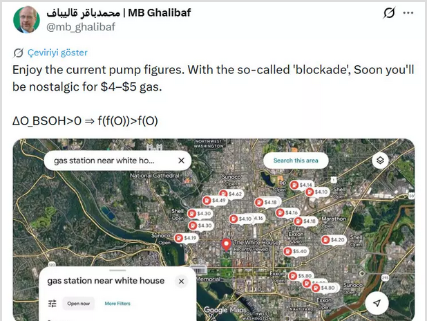 İran Meclis Başkanı Muhammed Bakır Galibaf, ABD’nin İran’a yönelik abluka kararının benzin fiyatlarında daha fazla artışa yol açacağına dikkat çekerek, şu paylaşımı yaptı: