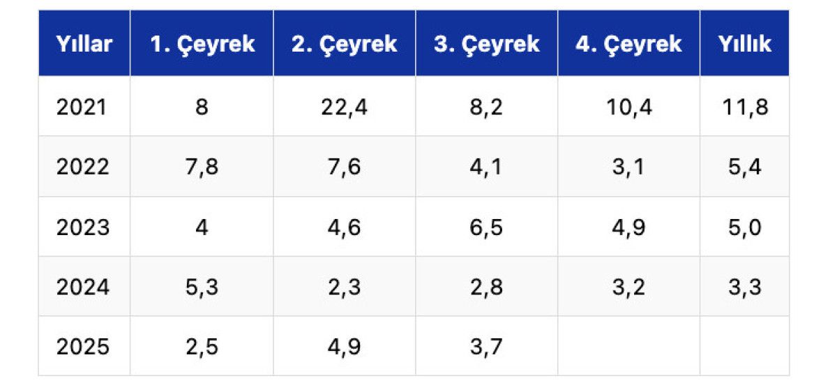 Türkiye ekonomisinin 2021'den bu yana büyüme hızı, yıllar ve çeyrekler itibarıyla şöyle: