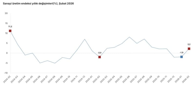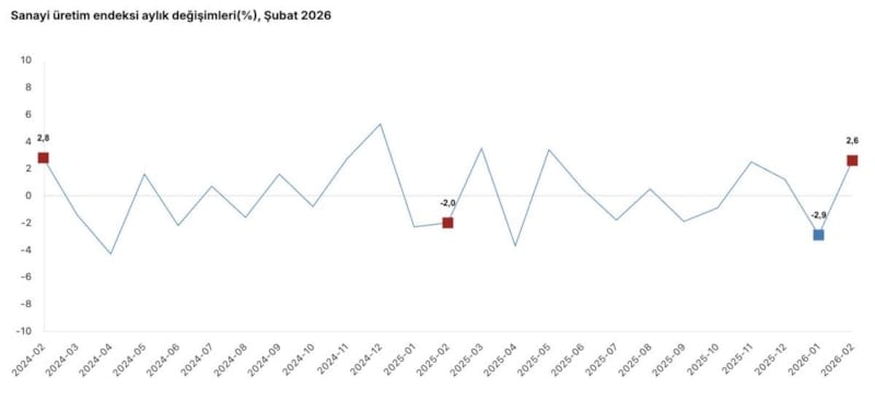 Şubat 2026 Sanayi Üretim Endeksi'ne göre sanayi üretimi aylık yüzde 2,6 ve yıllık yüzde 2,2 yükseldi.