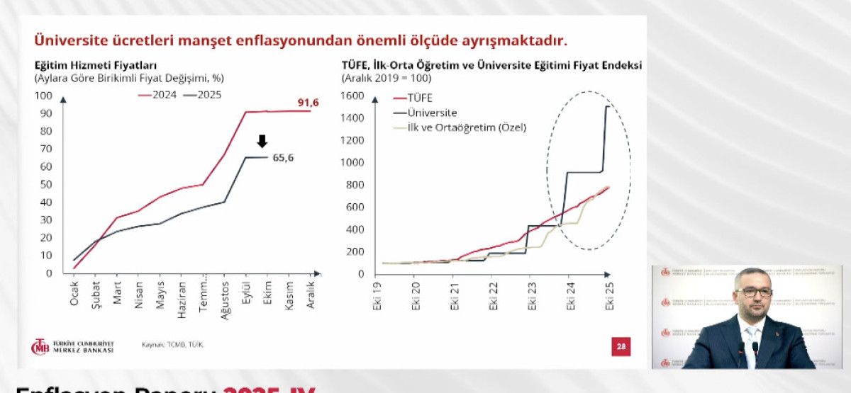 Fatih Karahan 2025 için ara hedefin yüzde 24 olarak korunduğunu açıklarken; yıl sonu enflasyon tahmin aralığının yüzde 25-29'dan yüzde 31-33 seviyesine yükseltildiğini söyledi. 2026 yılı için, ara hedef yüzde 16 olarak korunurken; tahmin aralığı yüzde 13-19 seviyesinde sabit kaldı.