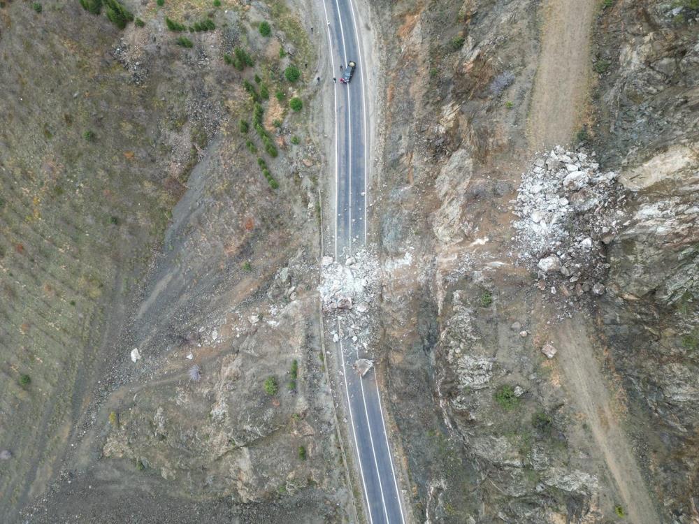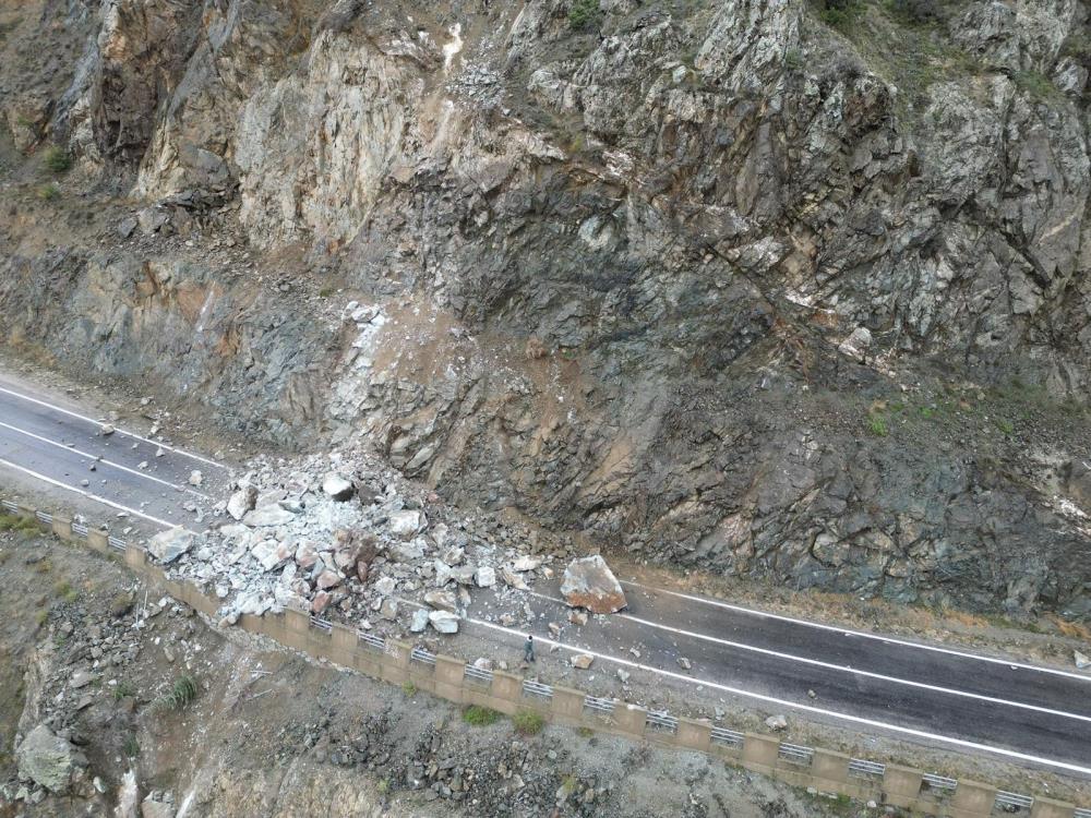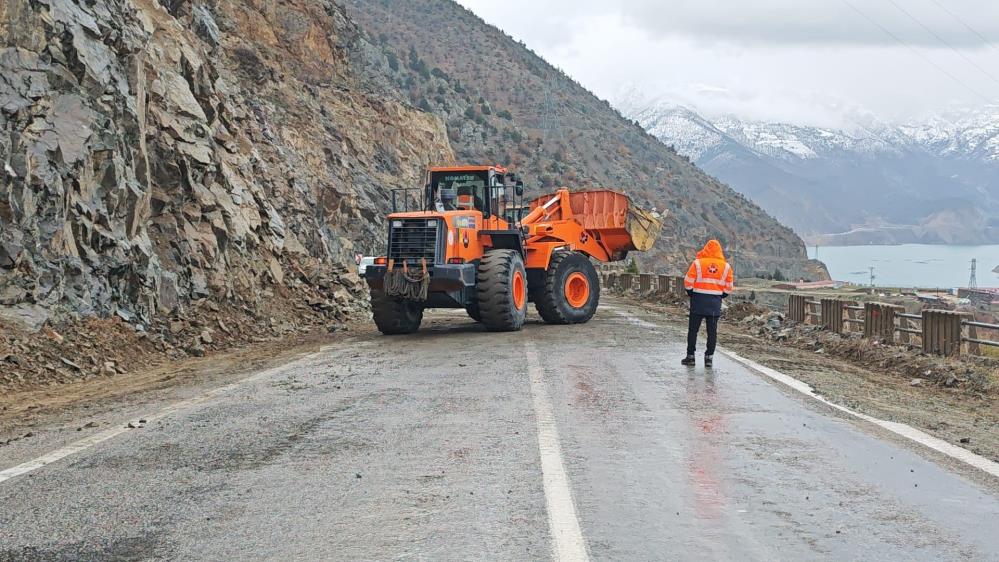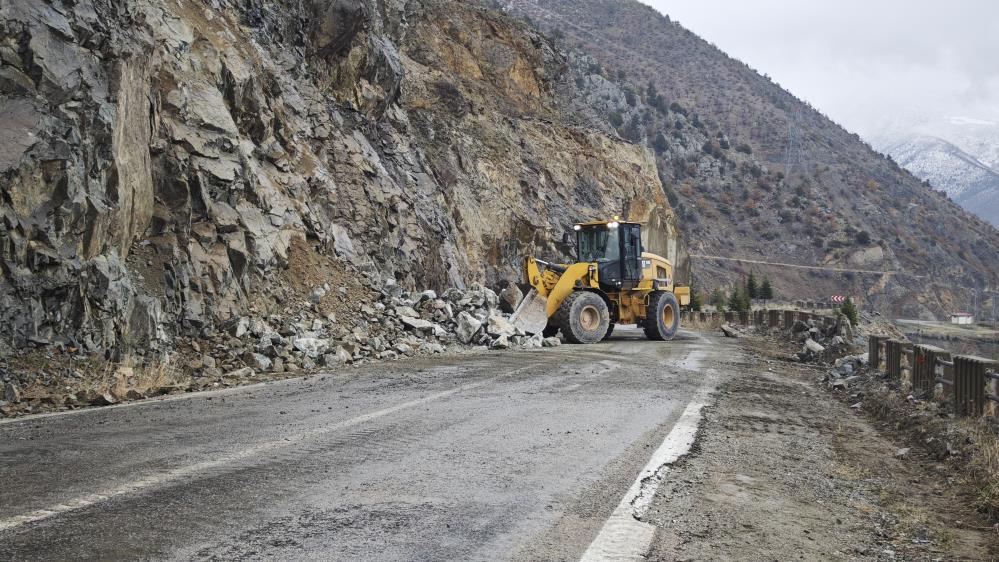 Yamaçtan kopan kaya parçaları nedeniyle ulaşıma kapanan karayolu için bölgeye sevk edilen ekiplerce çalışma başlatıldı.