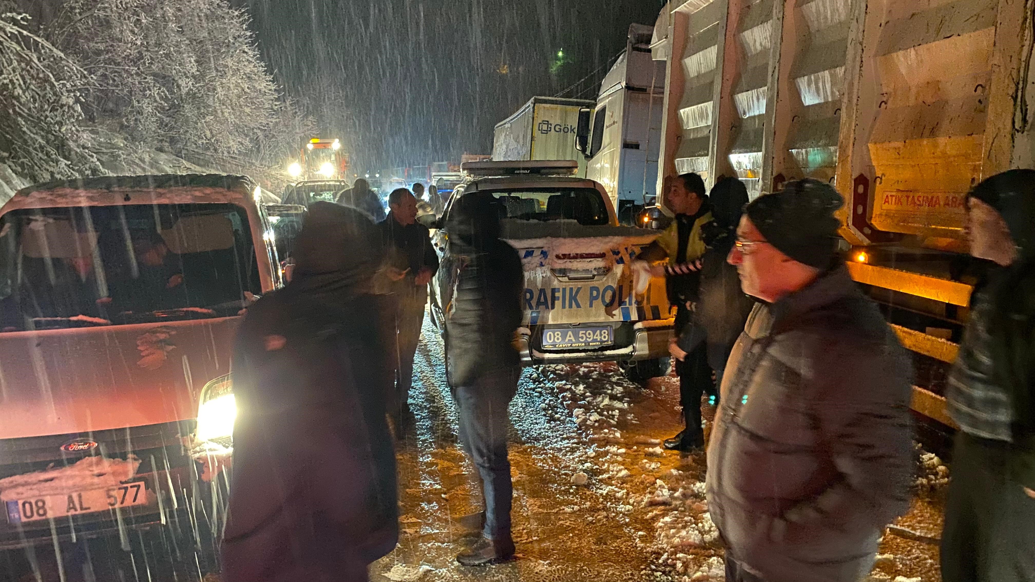 Hopa ve Borçka ilçeleri arasında artan tehlike nedeniyle trafik ekipleri, güvenlik amacıyla karayolunu ulaşıma kapattı. Sürücülere kar lastiği ve zincir kullanmaları konusunda uyarılarda bulunulurken, bazı araçlar yolda mahsur kaldı.
