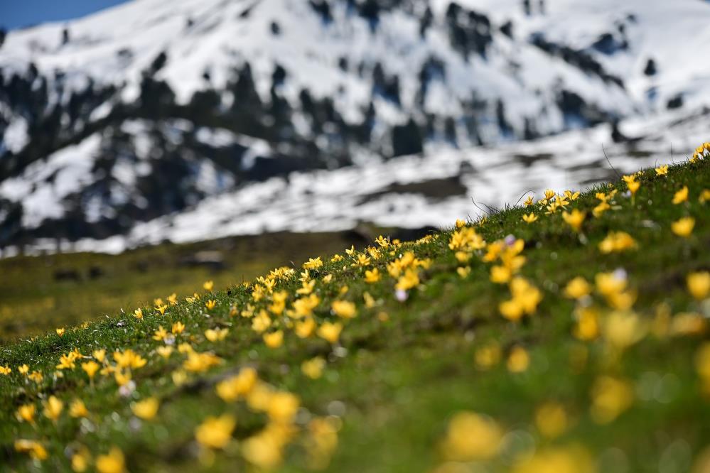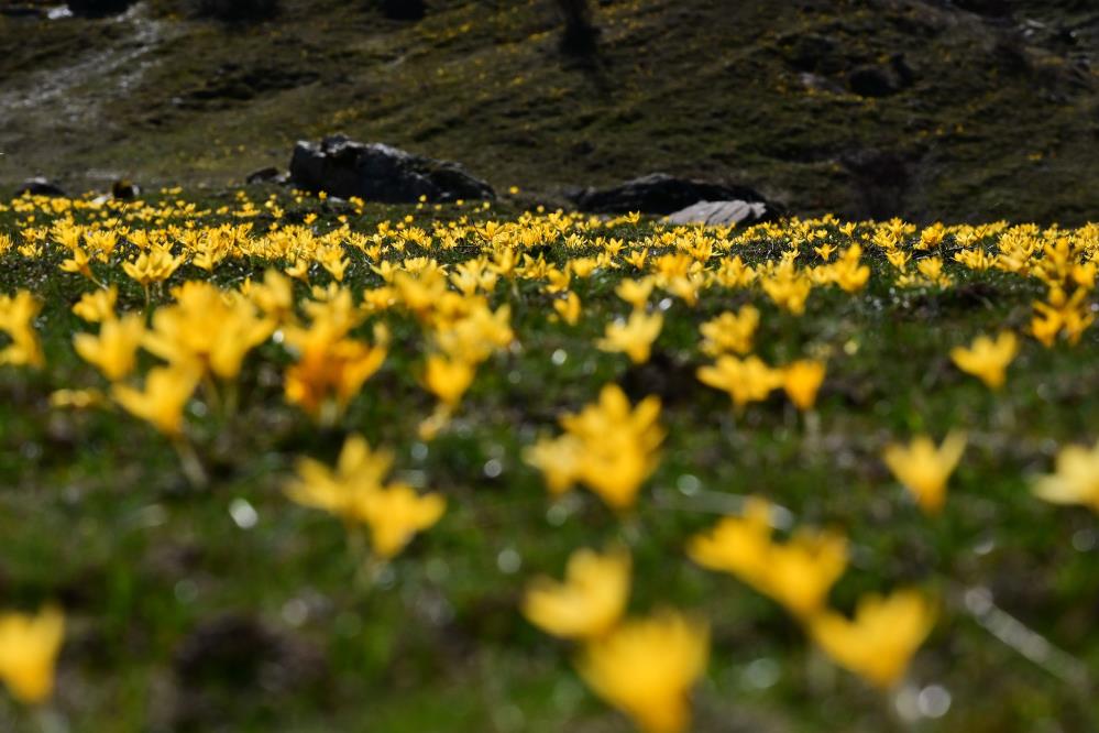 Karların ardından fışkıran bu renkli çiçekler, vadi boyunca metrelerce uzanan doğal bir halı görüntüsü oluşturarak görenleri kendine hayran bıraktı.