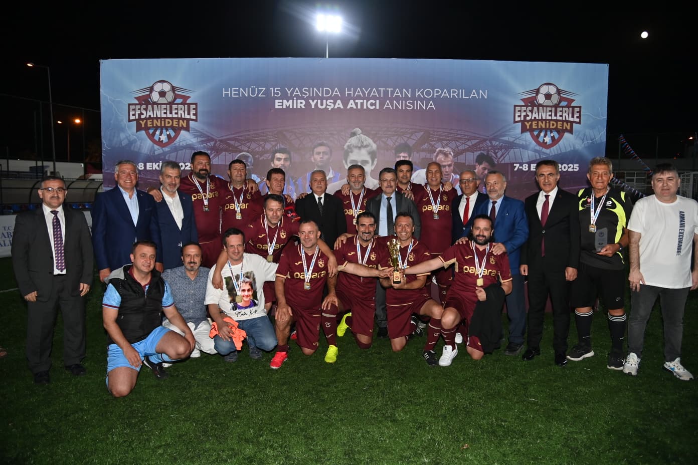 Trabzon Büyükşehir Belediyesi’nin ev sahipliğinde düzenlenen “Efsanelerle Yeniden” futbol turnuvası, Emir Yuşa Atıcı’nın anısına duygusal anlarla sona erdi. Faroz Futbol Sahası’nda gerçekleşen finalde Bordo Takım, penaltılarda 9-8’lik skorla şampiyonluğa ulaştı. Büyükşehir Belediye Başkanı Ahmet Metin Genç, turnuvanın sonunda Emir Yuşa’nın babası Mustafa Atıcı’ya imzalı forma ve plaket takdim etti.