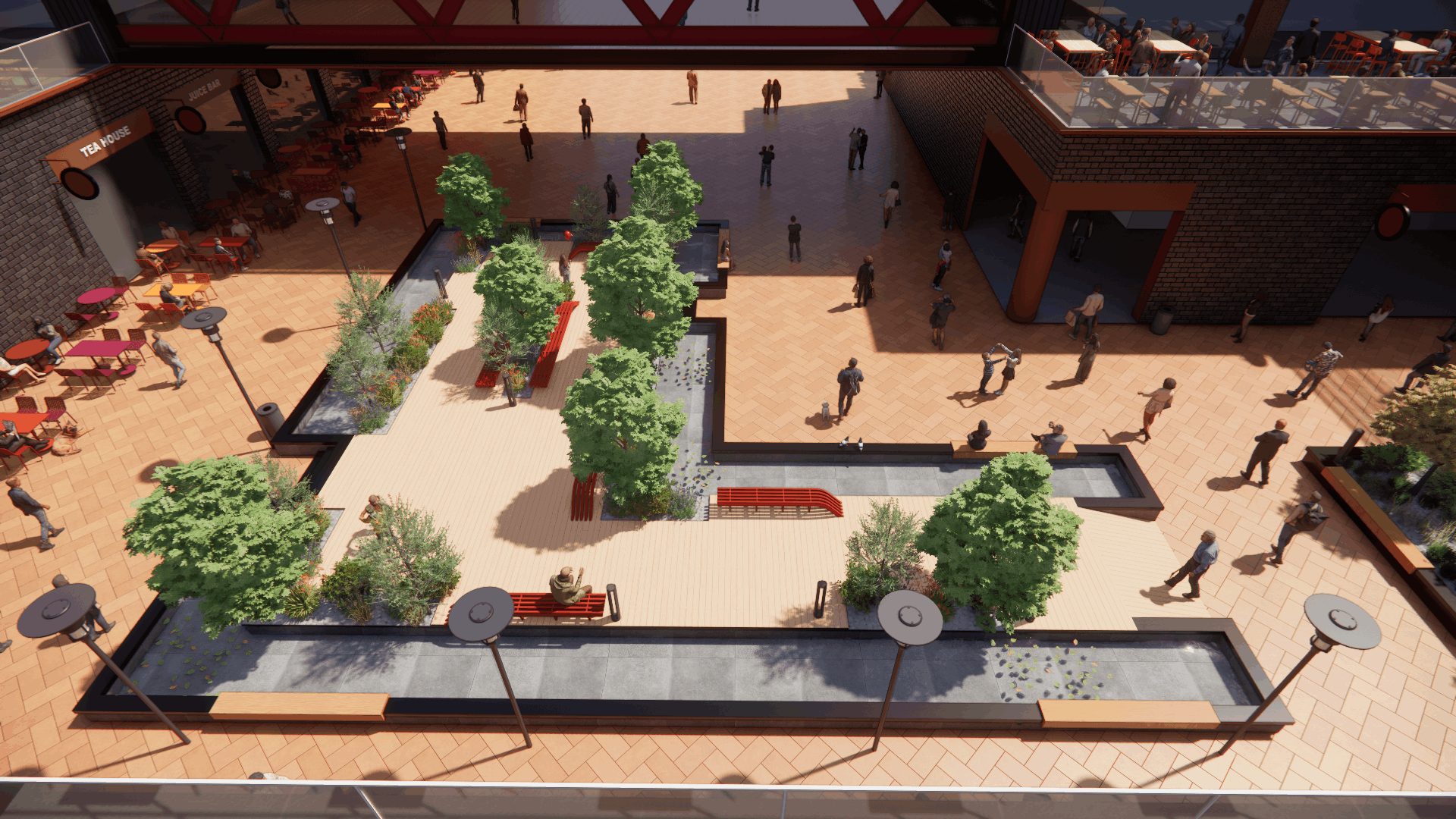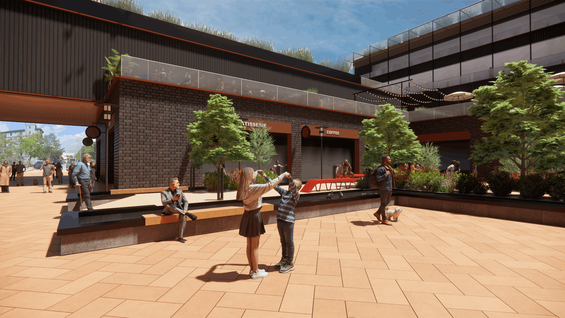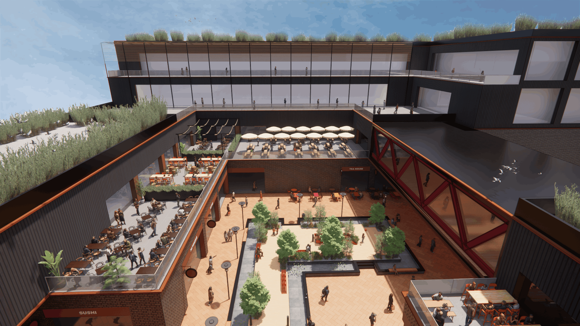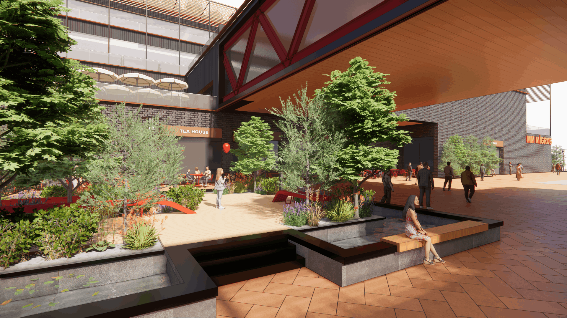 Projenin dikkat çeken yönlerinden biri, binalar arasında oluşturulan geniş açık alanlar ve ferah avlu düzeni. Bu düzen sayesinde proje sadece bir yapı değil, aynı zamanda insanların vakit geçirebileceği, nefes alabileceği bir sosyal yaşam alanı hâline geliyor. Gastro ve kafe bölümlerinin konumlandırıldığı katlarda yer alan teraslar, gün ışığını içeri alan açıklıklar ve peyzaj ile desteklenen alanlar proje atmosferine sıcaklık katıyor.