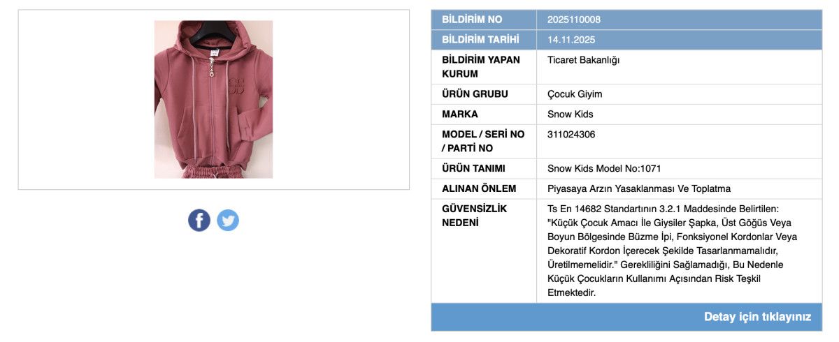 Bakanlık, güvenlik kriterlerini karşılamadığı tespit edilen iki farklı çocuk giyim ürünü için yasaklama ve toplatma kararı aldığını duyurdu.