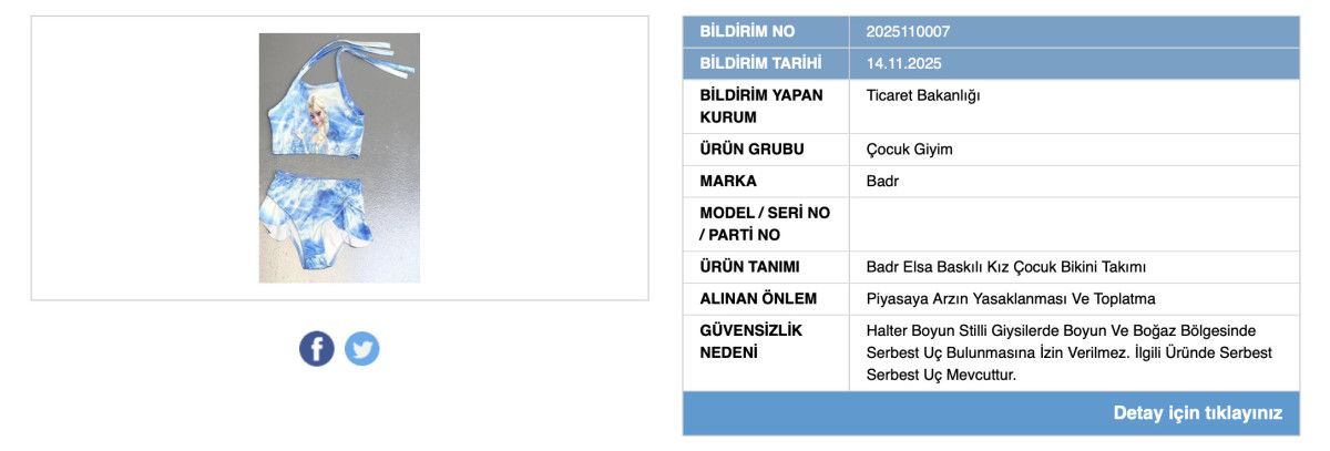 Aynı denetimlerde, “Badr” markalı baskılı kız çocuk bikini takımının da güvenlik standartlarına uygun olmadığı tespit edildi.