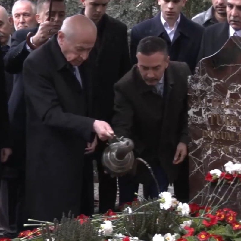 Bayramı Ankara'da geçiren Bahçeli, Türkeş'in mezarına karanfil bıraktı ve çiçekleri suladı.