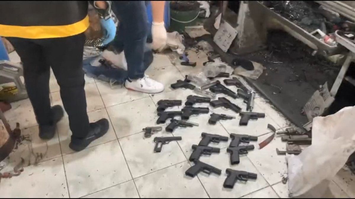 Silah atölyesine çevrilen iş yerinde ve ikamette 24 ruhsatsız tabanca, 1 kurusıkı tabanca, bu silahlara ait 87 mermi, 41 şarjör ile silah yapımında kullanılan çok sayıda malzeme ve silah parçası ele geçirildi.
