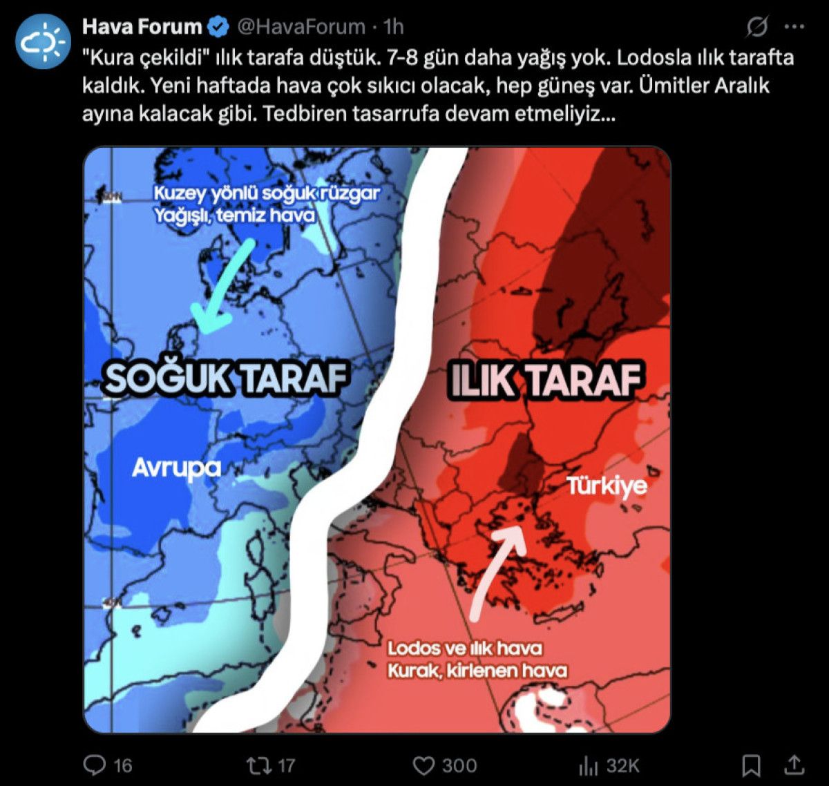 “Kura çekildi" ılık tarafa düştük. 7-8 gün daha yağış yok. Lodosla ılık tarafta kaldık. Yeni haftada hava çok sıkıcı olacak, hep güneş var. Ümitler Aralık ayına kalacak gibi. Tedbiren tasarrufa devam etmeliyiz…”