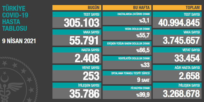 Günlük koronavirüs vaka sayılarında tedirgin eden artış devam ediyor. Açıklanan son koronavirüs tablosunda pozitif vaka sayısı 55 bin 791 oldu. İşte 9 Nisan koronavirüs tablosu