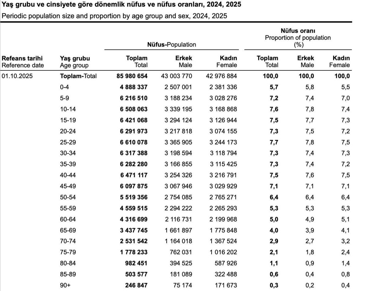 TÜİK verilerine göre Türkiye'nin nüfusu, 1 Ekim itibarıyla 85 milyon 980 bin 654 kişi oldu.