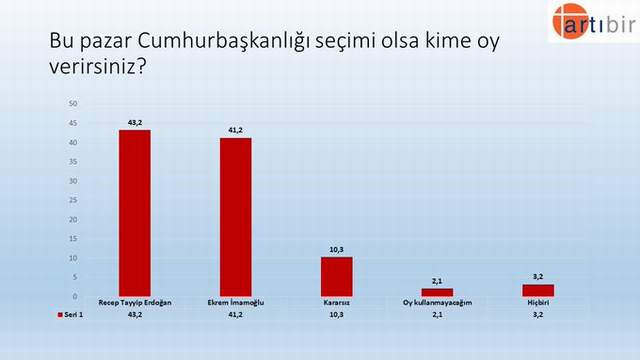 Tabloya göre Recep Tayyip Erdoğan yüzde 43.2 iken Ekrem İmamoğlu yüzde 41.2 olarak ölçüldü. İmamoğlu ile Erdoğan arasındaki oy farkı da ilk kez bir ankette bu kadar birbirine yakın olarak çıktı.