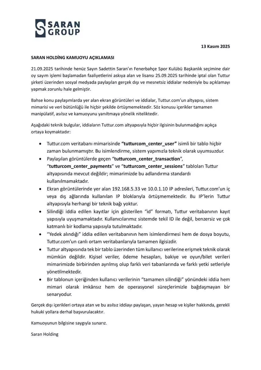 Saran Group, paylaşımlarda geçen tablo isimleri, IP adresleri ve veri yapılarının kendi sistemleriyle teknik olarak uyumsuz olduğunu belirtti. Ayrıca iddiaları yayan hesaplar hakkında hukuki süreç başlattıklarını duyurdu.