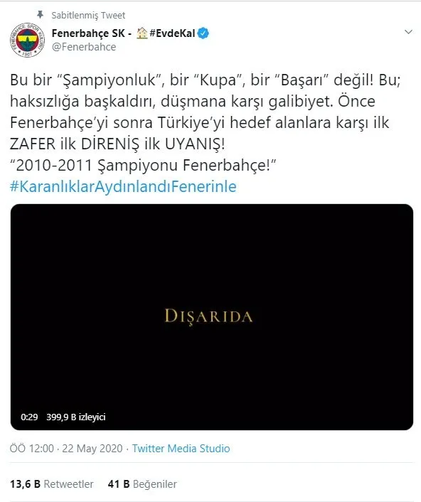 Fenerbahçe, resmi Twitter hesabından 2010-2011 sezonu için paylaşımda bulundu. Sarı lacivertli takımın yaptığı paylaşımda,"Bu bir "şampiyonluk", bir "kupa", bir "başarı" değil! Bu; haksızlığa başkaldırı, düşmana karşı galibiyet. Önce Fenerbahçe'yi sonra Türkiye'yi hedef alanlara karşı ilk zafer ilk direniş ilk uyanış!" ifadeleri kullanıldı.