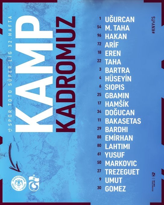 Süper Lig'in 32. haftasında yarın 16.00'da Konyaspor ile karşılaşacak olan Trabzonspor'da maç kafilesinde yer alan isimler belli oldu.
