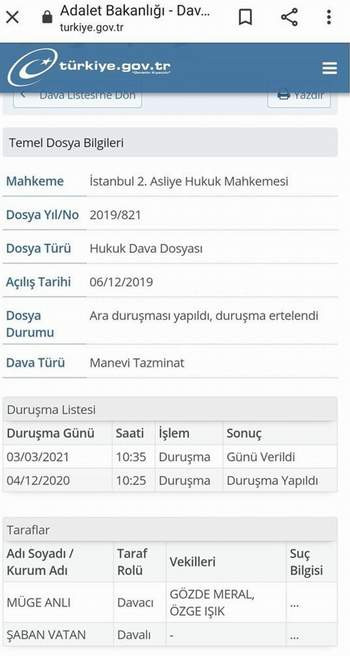 e-Devlet üzerinden kendisine açılan davanın ekran görüntüsünü paylaşan Vatan, “Çocuk canı Rabia Naz’ın ardındaki süreçten annesi ve babasını acısıyla dalga geçtin üstüne yetmedi intihar etmiş yalanı söyledin. Yetmedi 1 TL’lik tazminat davası açtın üzülme Müge Anlı 1 TL ayrıca kuru ekmek bedeli olarak da 12 TL göndereyim IBAN gönder” dedi.