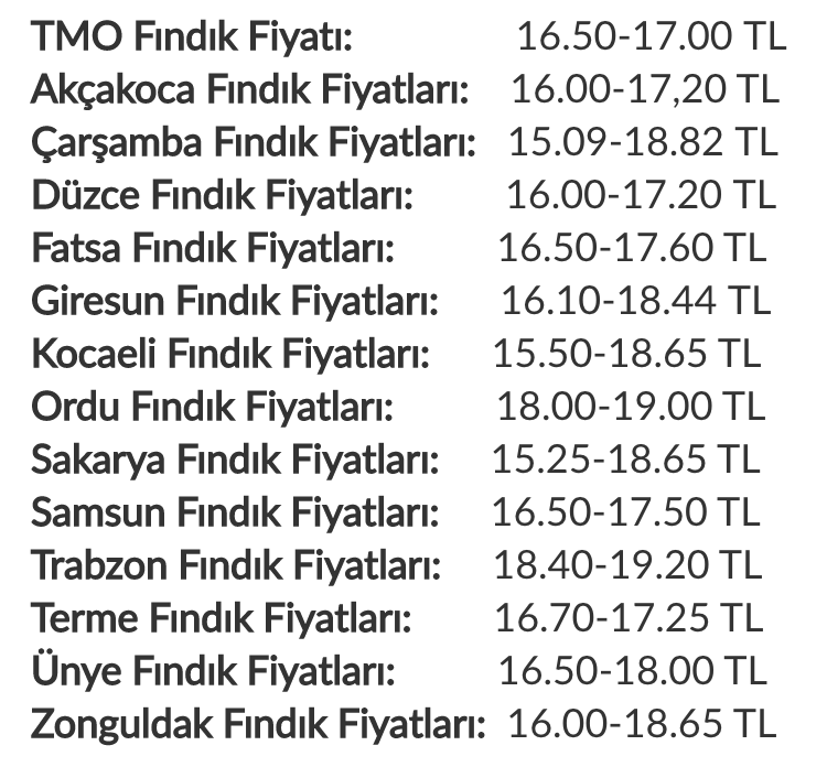 Cumhurbaşkanı Erdoğan'ın sezon açılmadan önce 16.50-17 TL olacağını söylemesi ile TMO fındık alım fiyatı 16.50-17 TL olarak sabitlendi.