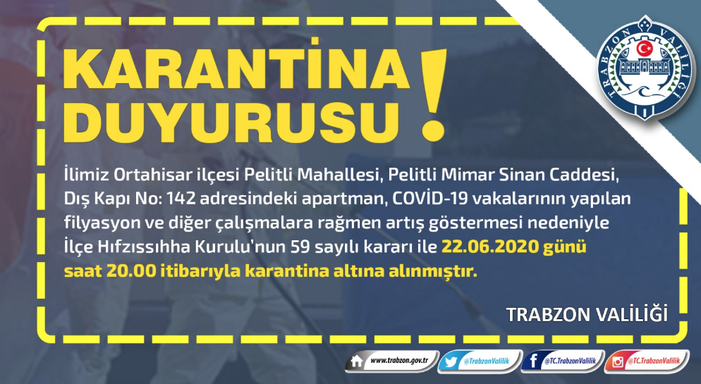İlçemiz Pelitli Mahallesi, Pelitli Mimar Sinan Caddesi, Dış Kapı No: 142 adresinde, COVİD-19 vakalarının yapılan filyasyon ve diğer çalışmalara rağmen artış göstermesi nedeniyle, ilgili apartmana giriş çıkışlara izin verilmemesine ve 22.06.2020 saat 20.00 itibarıyla ikinci bir emre kadar karantina altına alınmasına,