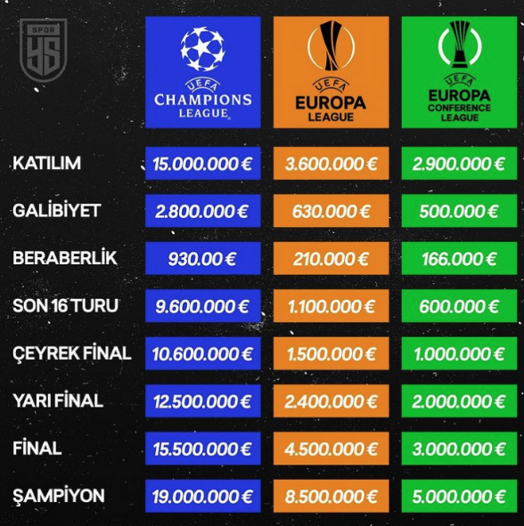 İşte Şampiyonlar Ligi, Avrupa Ligi ve Konferans Ligi'nde takımların kazanacakları ücretler;